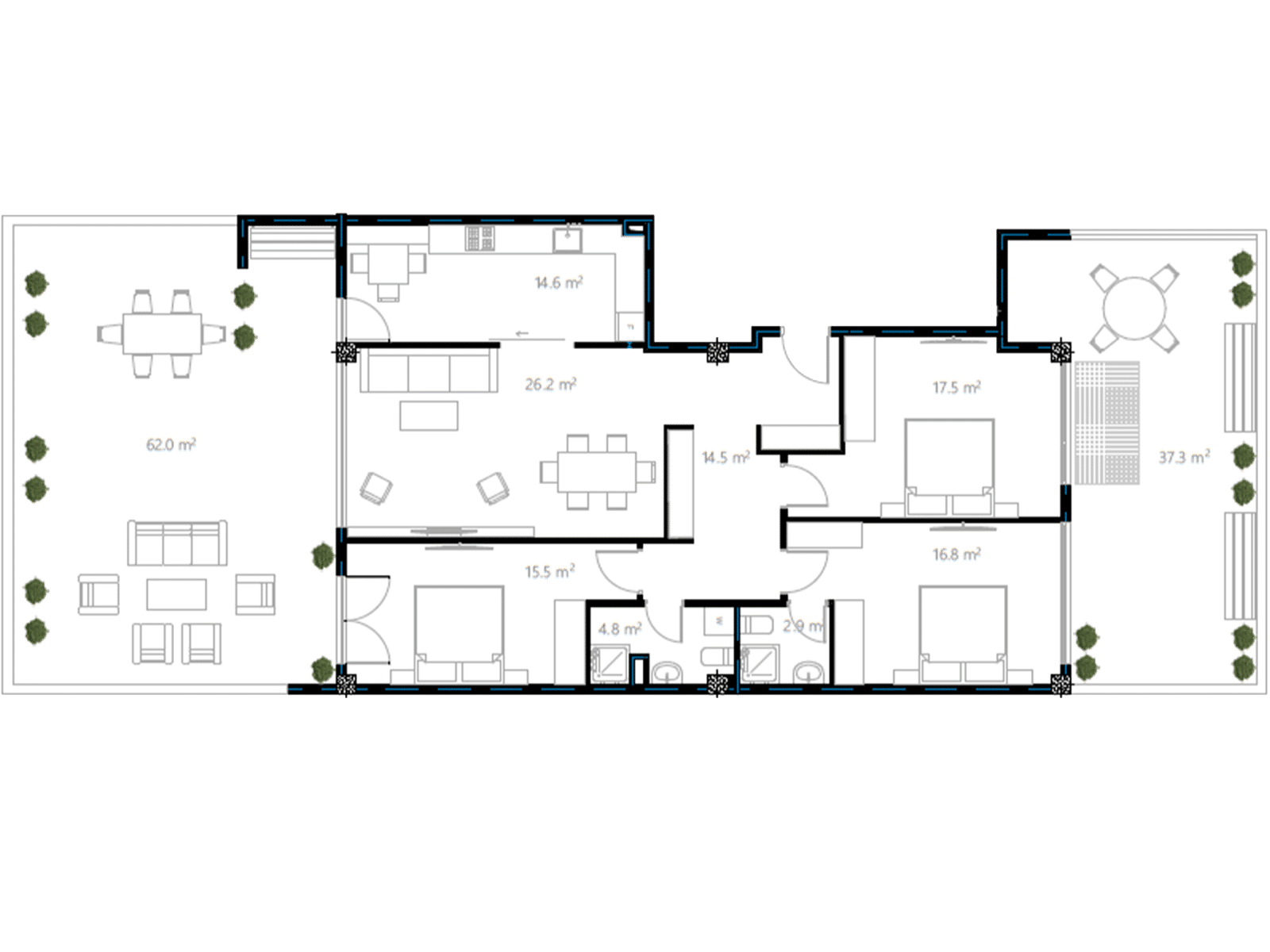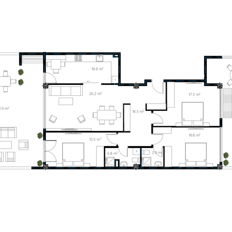 • Total Area of Balconies: 100.0 m²